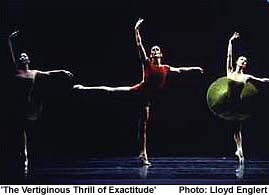 February 7, 9, 2002 San Francisco Ballet: Without Words, Angelo, Prism "Nacho Duato’s exquisite "Without Words" only becomes more beautiful with each viewing. The starkness of the figures moving through a dark space, with a shadowy echo of the dancers projected on a hanging curtain are only small, yet important details in a work that has been conceptualized with deep sensitivity from start to finish." February 5, 2002, Cal Performances: James Joyce, Marcel Duchamp, Erik Satie: An Alphabet "An Alphabet" is a sprawl of ideas juxtaposed into what could be a fascinating collage of thought. However, the very static and at times confusing direction of this "performed installation" served to smother rather than illuminate the proceedings and ended up producing a bewildering barrage of stimuli for the ears and hardly anything for the eye. A few audience members lasted only a bit longer than four minutes and thirty-three seconds into the piece before making their way quietly up the aisle."